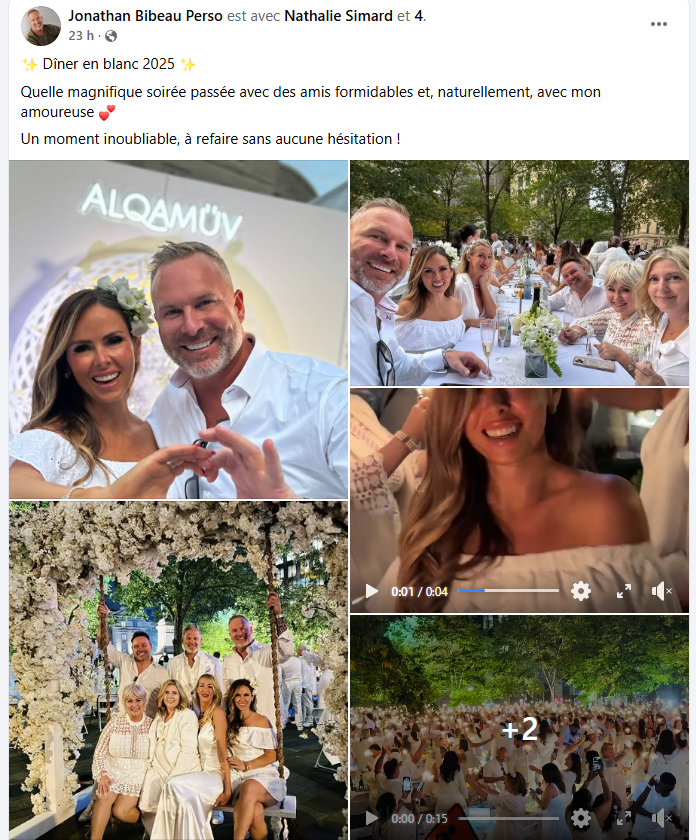 «Vendredi avait lieu le Dîner en blanc à Montréal, une première expérience pour moi, vécue en excellente compagnie! Avec mes amis (Anick – Zorah Cosmétique, ma gérante Nancy Gauthier, Jonathan Bibeau et sa conjointe Kristel). J’ai adoré et je prévois répéter l’expérience afin de revivre ce moment unique, féerique et rempli d’émotions. Bravo à toute l’organisation pour ce ce beau moment d’un blanc immaculé! 👏», écrivait avec gratitude Nathalie pour ce beau groupe d’amis, dont Jonathan.