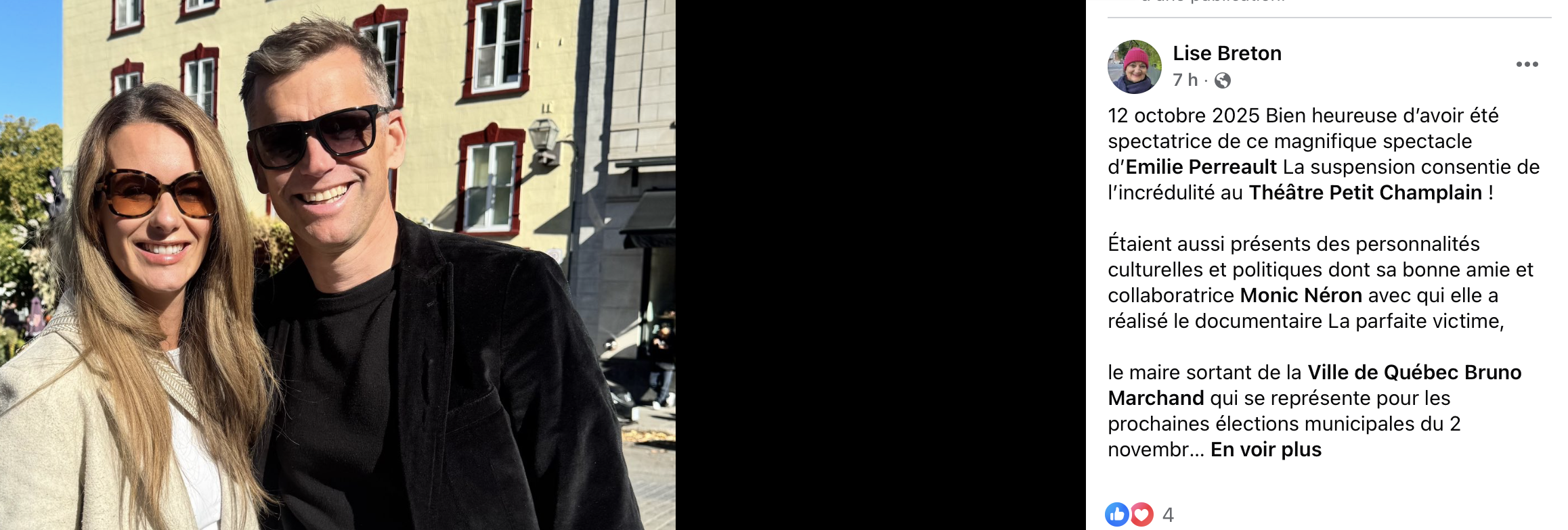 «12 octobre 2025. Bien heureuse d’avoir été spectatrice de ce magnifique spectacle d’Émilie Perreault: La suspension consentie de l’incrédulité au Théâtre Petit Champlain! (…) Étaient aussi présentes des personnalités culturelles et politiques, dont sa bonne amie et collaboratrice Monic Néron, avec qui elle a réalisé le documentaire La parfaite victime, le maire sortant de la ville de Québec, Bruno Marchand, qui se représente pour les prochaines élections municipales du 2 novembre prochain», partageait la dame, en marge de trois photos, dont l’une où l’on retrouvait les tourtereaux tout souriants.