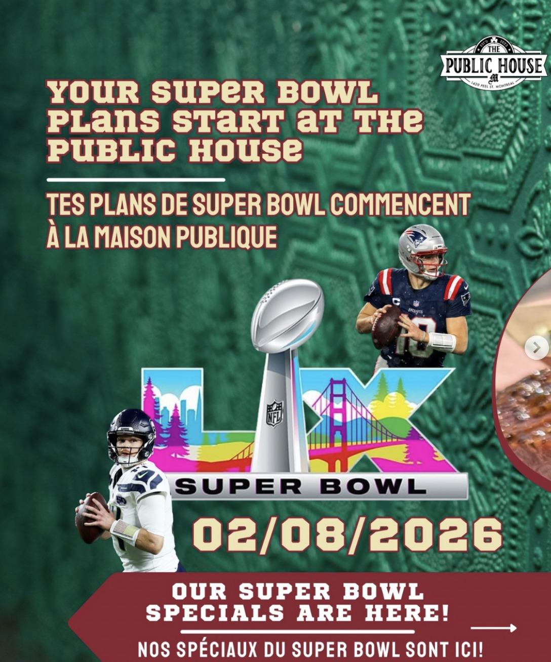 On Sunday, February 8, 2026, Montreal will be buzzing with Super Bowl fever! Whether you’re a football fan, a foodie, or just looking for a festive evening with friends, the city is full of bars and restaurants ready to welcome you to experience one of the most anticipated sporting events of the year. Giant screens, pitchers, chicken wings, tasty cocktails, and the halftime show: there will be something for everyone. We’ve put together a selection of the best spots to enjoy the game in an electric atmosphere!