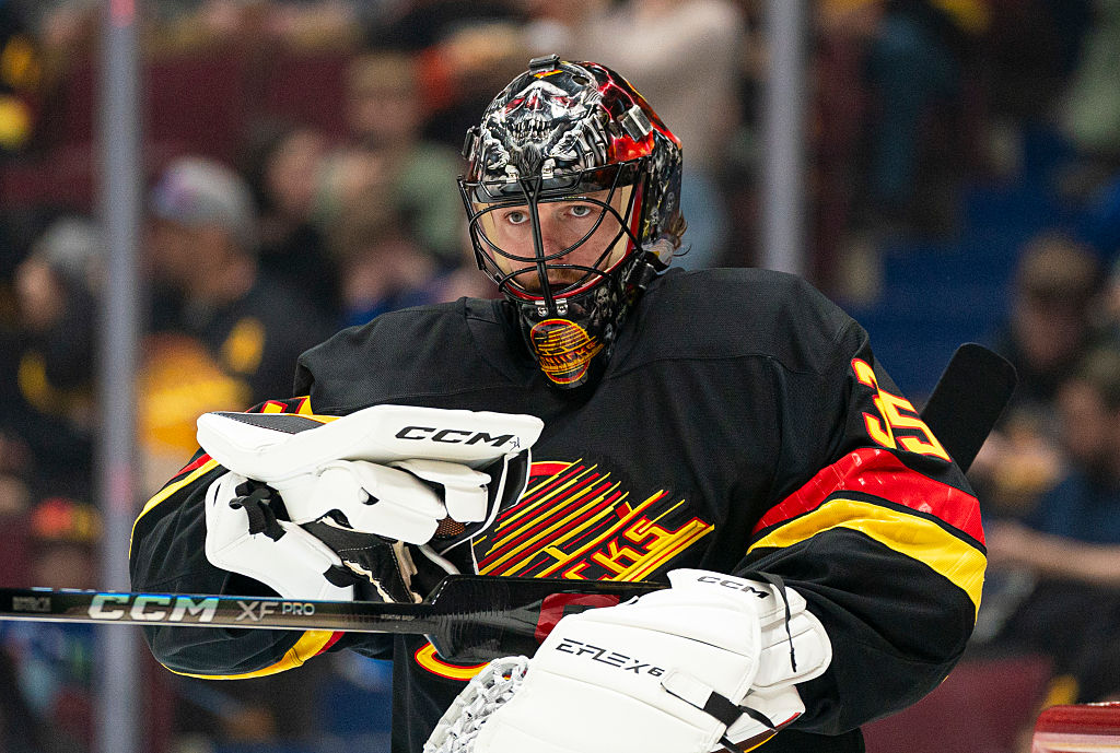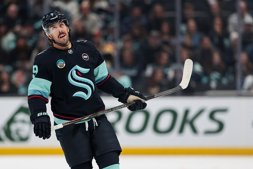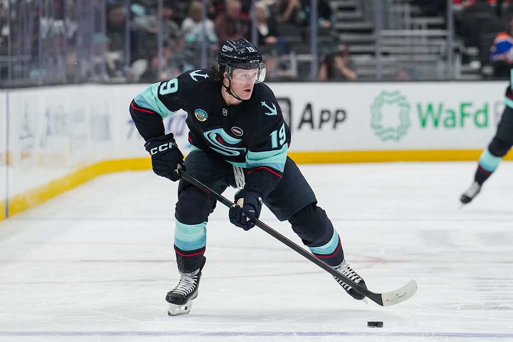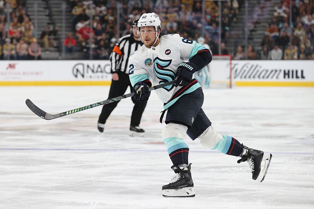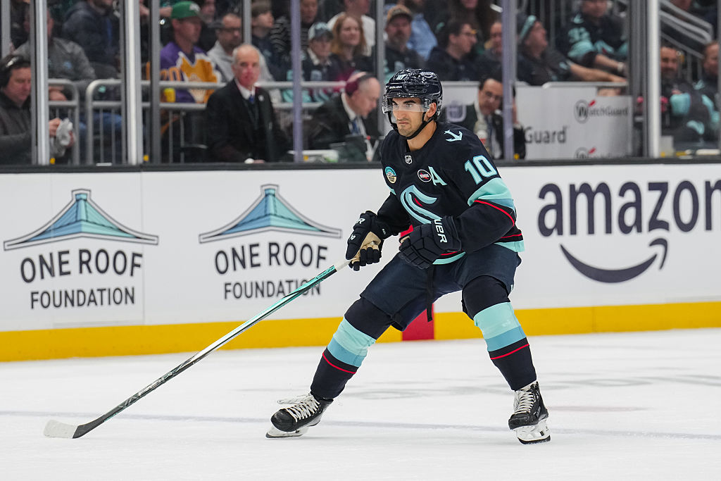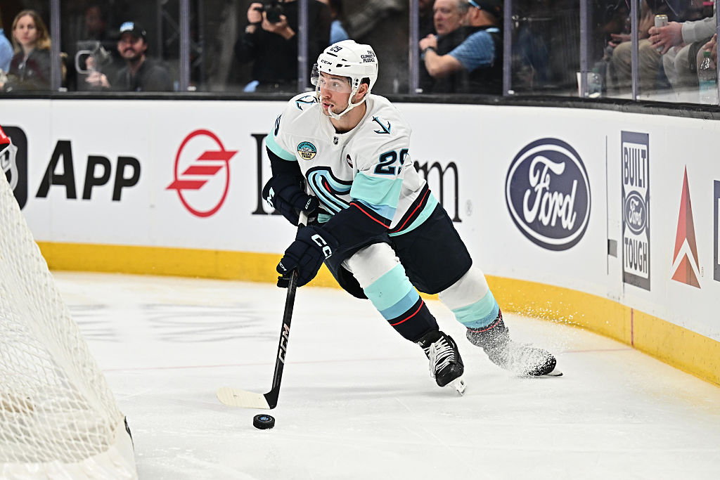 LAS VEGAS, NEVADA - 10 AVRIL : Matty Beniers #10 des Kraken de Seattle se prépare pour un affrontement contre les Golden Knights de Vegas au T-Mobile Arena le 10 avril 2025 à Las Vegas, Nevada. (Photo par Zak Krill/NHLI via Getty Images)