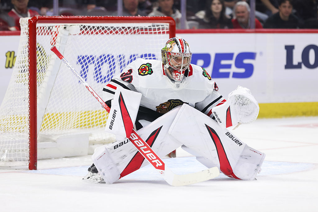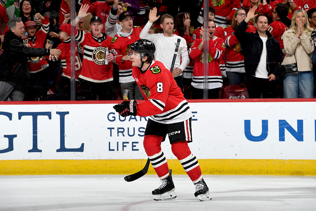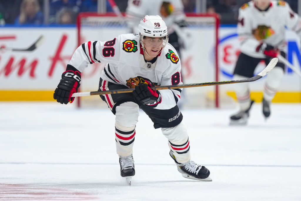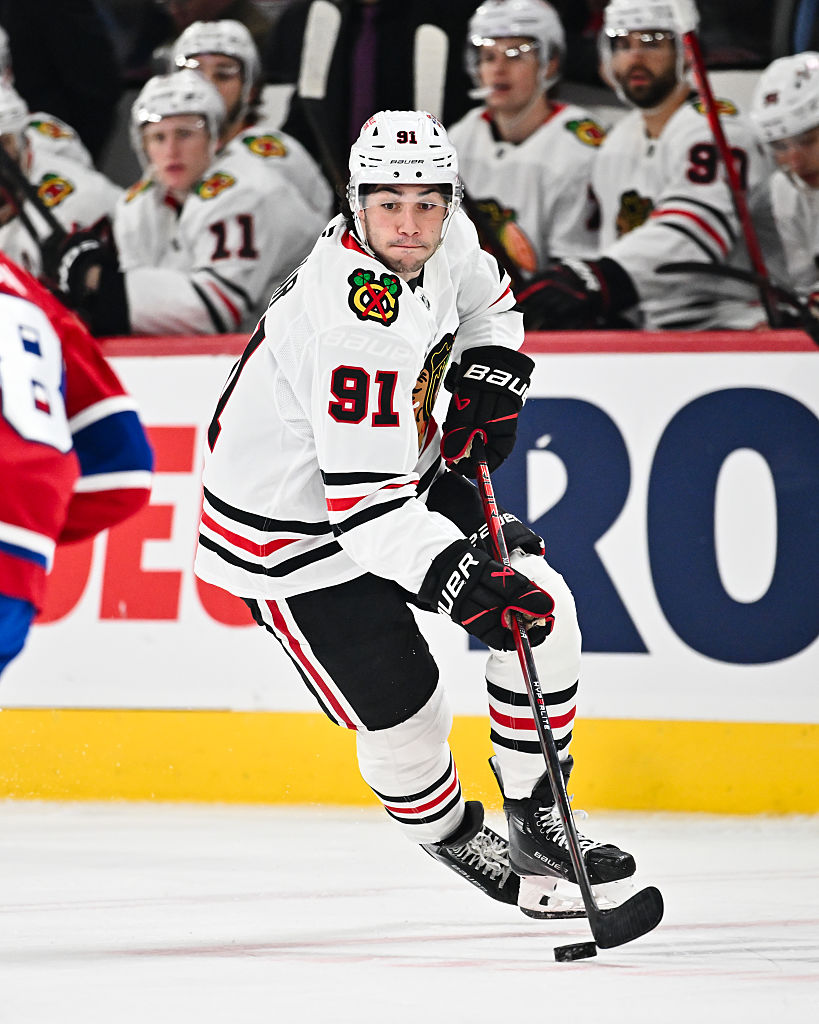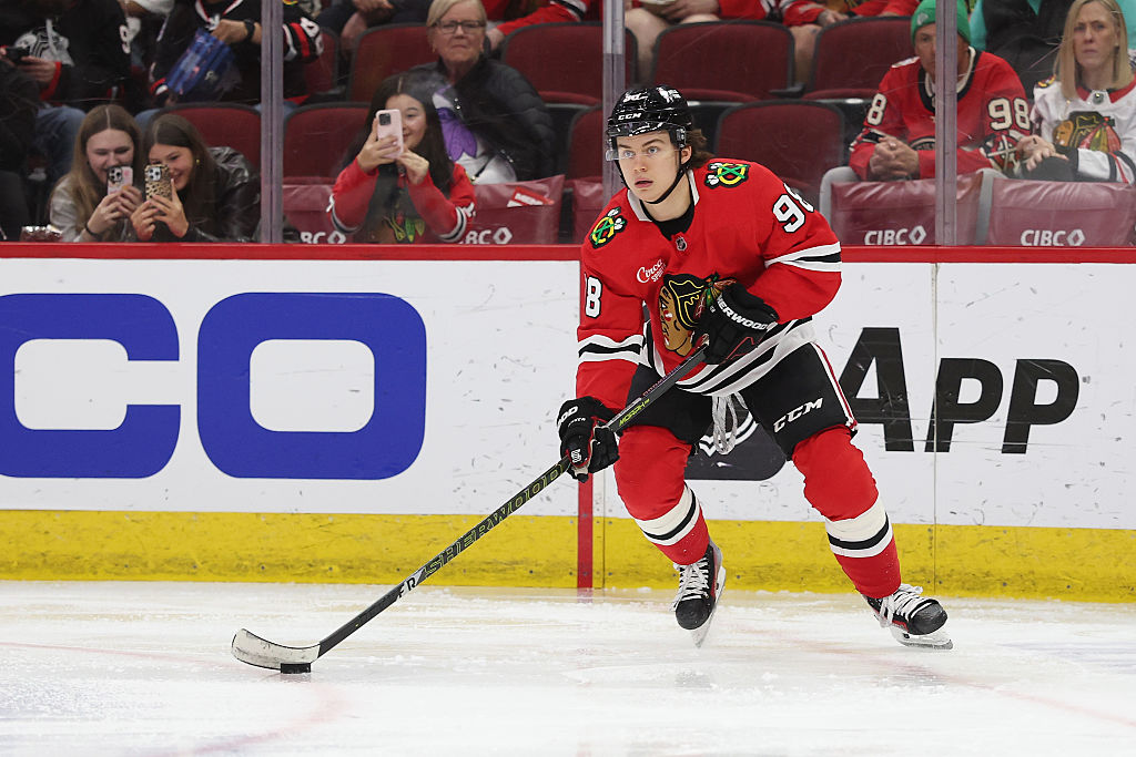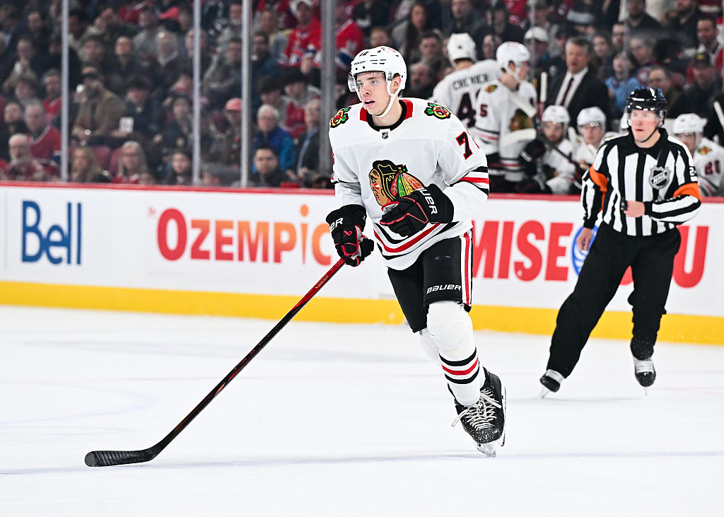 OTTAWA, ONTARIO - 15 AVRIL : Connor Bedard #98 des Blackhawks de Chicago patine pendant un arrêt de jeu durant la troisième période de leur match contre les Sénateurs d'Ottawa au Centre Canadian Tire le 15 avril 2025 à Ottawa, Ontario. (Photo par Troy Parla/Getty Images)