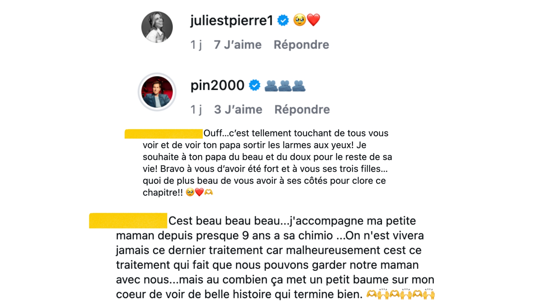 «C’est beau, beau, beau… J’accompagne ma petite maman depuis presque 9 ans à sa chimio… On ne vivra jamais ce dernier traitement car malheureusement c’est ce traitement qui fait que nous pouvons garder notre maman avec nous… mais au combien ça met un petit baume sur mon coeur de voir de belles histoires qui terminent bien», témoigne un autre.