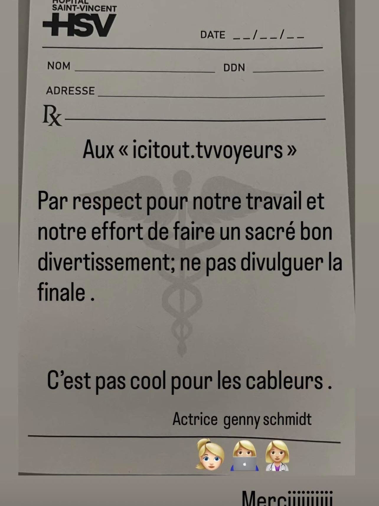 Sous le sceau d’une prescription fictive de l’Hôpital Saint-Vincent, l’équipe a lancé un avertissement clair aux fans et aux «icitout.tvvoyeurs»: