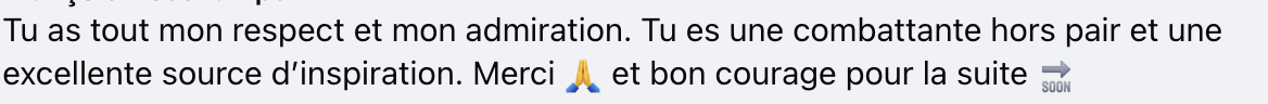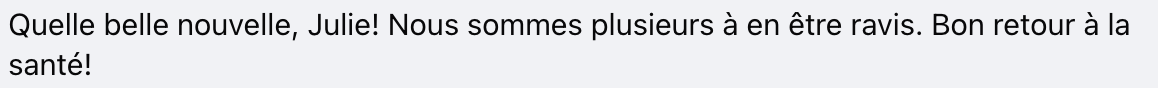 Félicitations à Julie pour cette grande étape franchie avec courage et force. Nous lui souhaitons une suite remplie de douceur, de beaux jours à venir et, surtout, la santé.
