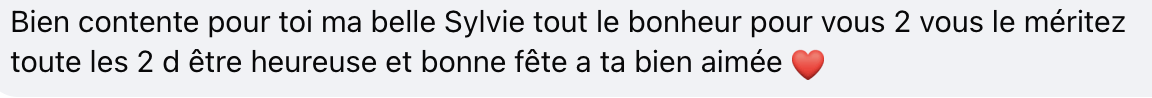«Bien contente pour toi, ma belle Sylvie. Tout le bonheur pour vous deux, vous méritez toutes les deux d’être heureuses et bonne fête à ta bien-aimée», souligne une autre.