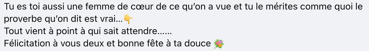«Tu es toi aussi une femme de coeur de ce qu’on a vu et tu le mérites, comme quoi le proverbe qu’on dit est vrai… Tout vient à point à qui sait attendre… Félicitations à vous deux et bonne fête à ta douce», commente un autre utilisateur de la plateforme.