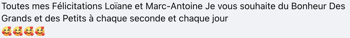 «Toutes mes félicitations Loïane et Marc-Antoine. Je vous souhaite du bonheur, des grands et des petits, à chaque seconde et chaque jour», lance un internaute.