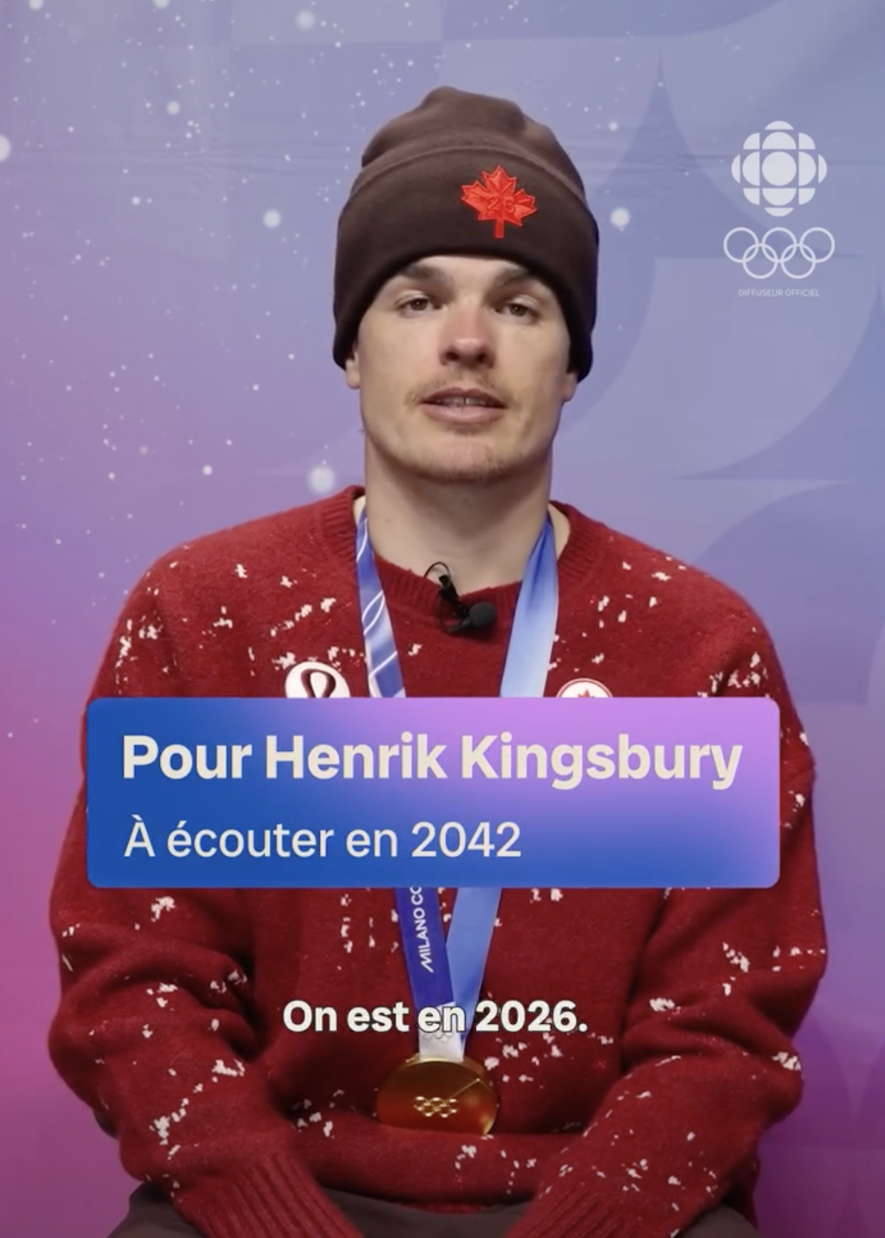 «Salut Henrik, c’est papa. On est en 2026, c’est mes derniers Jeux olympiques. Il y a quelques heures, papa a gagné sa deuxième médaille d’or olympique. Présentement, tu as un an et demi, tu es dans la poussette d’or, tu fais dodo, tu es brûlé ben raide. Ça a été vraiment spécial de skier devant toi aujourd’hui. J’essaie de t’imaginer à 18 ans, je suis sûr que tu es un humain incroyable, que tu es sportif comme ton père, que tu es beau comme ta mère. Là, je suis assis ici en 2026, tu vas regarder les vidéos là dans 16 années et quelques, puis je sais que tu es exactement où est-ce que tu veux être. Je viens de finir ma carrière olympique, je viens de gagner ma cinquième médaille en cinq. Je ne sais pas si tu fais du ski comme papa, si t’en fais, tant mieux, si tu fais d’autres choses, c’est bien correct. Un de mes rêves, j’ai toujours voulu qu’au moins un de mes enfants me voie skier. J’ai pu vivre ce rêve-là qui est personnel à moi. Tous les moments que j’étais stressé ici en 2026 aux Jeux olympiques, à mes derniers, les seules choses que j’ai pensé, c’est à toi, Henrik. À chaque fois que je voyais ta petite face d’un an et demi, ça m’enlevait de la pression sur les épaules, puis ça remettait un petit équilibre à comment je me sentais, puis à remettre mes priorités au bon endroit. Oui, le ski, c’est vraiment important à mes yeux, ça a toujours été ma priorité avant que tu viennes au monde, mais maintenant, c’est toi, puis ça va continuer de l’être jusqu’à temps que je ne sois plus là. J’ai hâte à chacune des étapes de ta vie, puis je vais toujours être là, dans les hauts, les bas, papa va être là», partageait le champion olympique.
