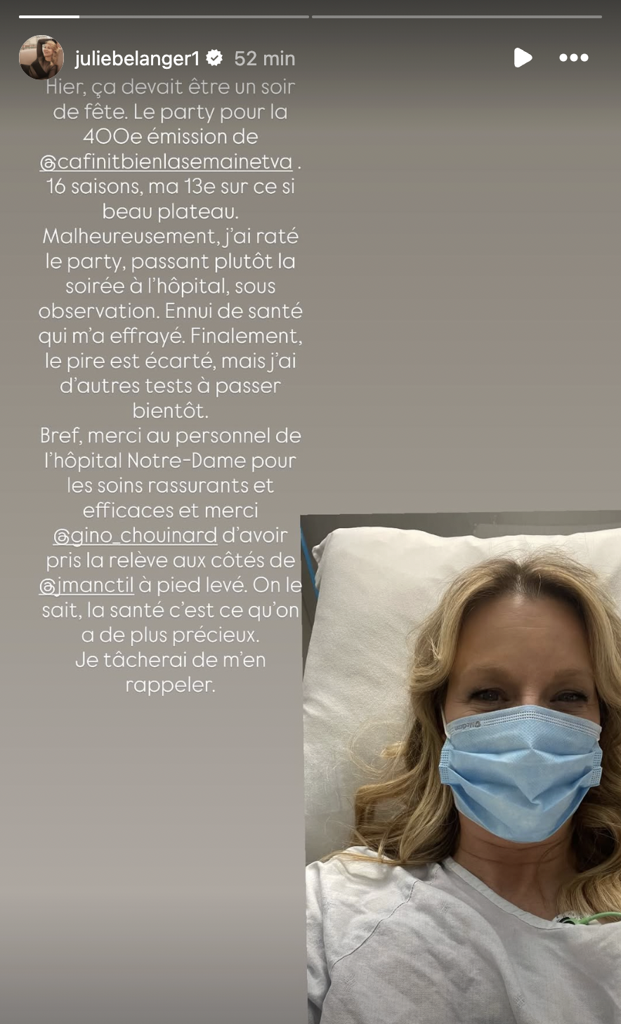Dans ce message, accompagné d’une photo prise à l’hôpital, Julie avait tenu à remercier Gino Chouinard d’avoir assuré la relève en son absence. Elle en avait aussi profité pour se montrer rassurante, affirmant que le pire avait été écarté, bien qu’elle devrait éventuellement passer d’autres examens.