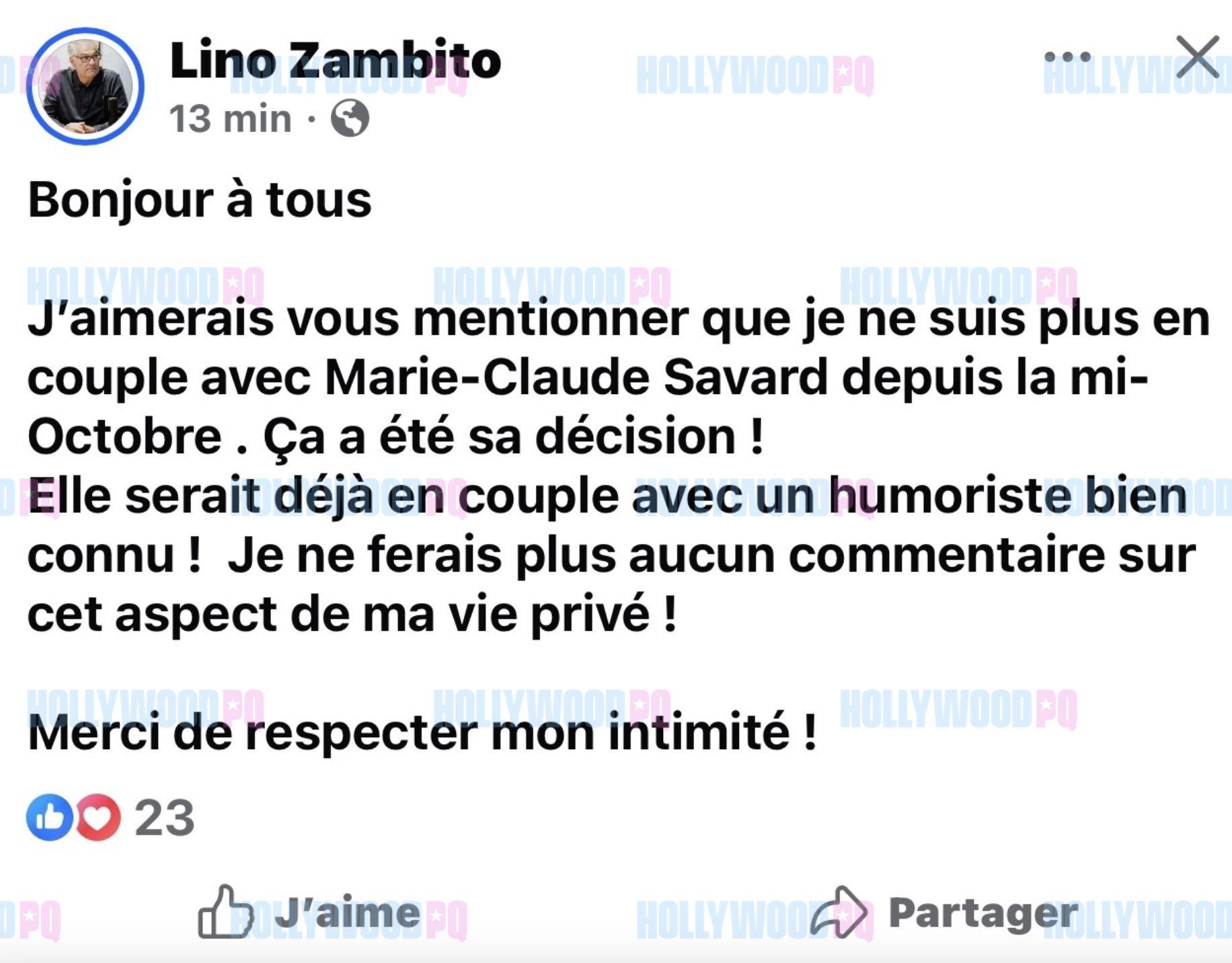 «Bonjour à tous. J’aimerais vous mentionner que je ne suis plus en couple avec Marie-Claude Savard depuis la mi-octobre. Ça a été sa décision! Elle serait déjà en couple avec un humoriste bien connu! Je ne ferai plus aucun commentaire sur cet aspect de ma vie privée! Merci de respecter mon intimité», lançait-il, dans un ton où l’on croit percevoir une pointe d’amertume, peut-être.