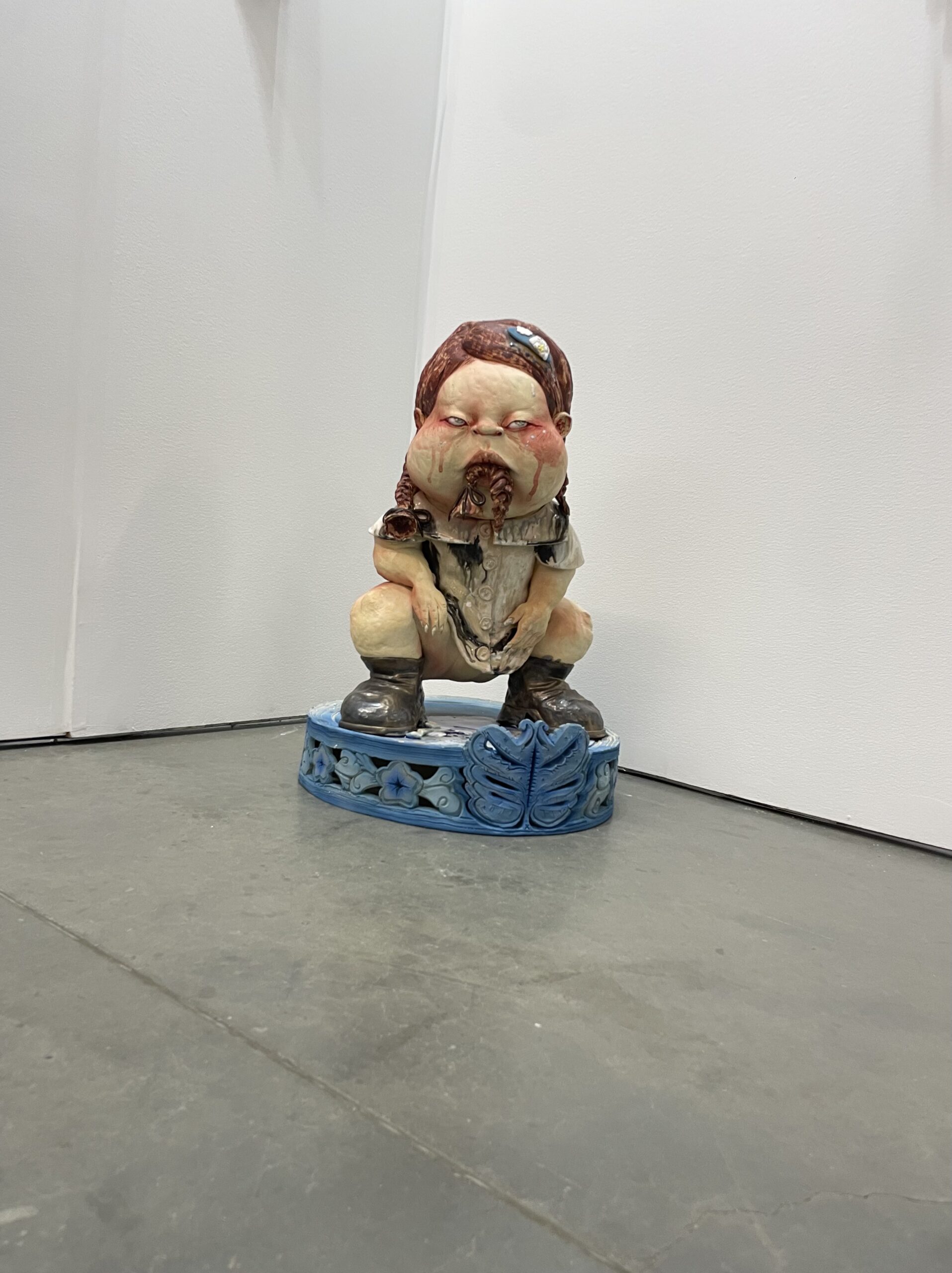 Entre une petite fille qui vomit ses propres tresses en position de sumo et une autre qui découpe sa robe, en portant sur son dos un poisson qui tire la langue, on se pose bien des questions en observant ces statuettes! Nul doute, il s’agit d’un des kiosques qui a suscité le plus de réactions.