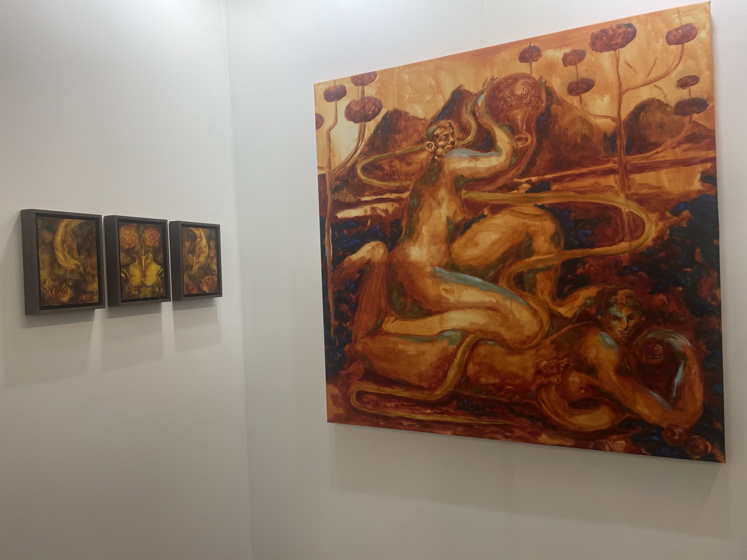 Puis, il y a les tableaux réalisés à l’huile et à l’acrylique de Catherine Morin, présenté par Wishbone Galerie de Montréal. En contemplant Les candidats, pièce maîtresse de sa collection, le regard se perd aisément dans les courbes des montagnes et des corps, magnifiés par des tons chauds.