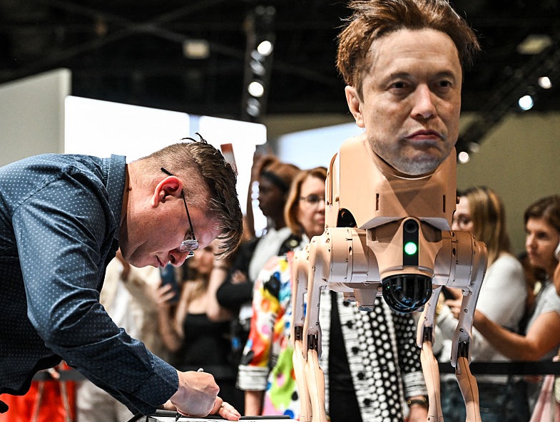The name of the concept: « Regular Animals. » The behavior of these creatures is as fascinating as it is disturbing. They wander around an enclosure, sometimes nearly colliding with each other. Musk puckers his lips, Picasso stares into space. But the most provocative aspect lies in their creative process: at random, the robots tip backwards and, via a screen displaying poop mode, physically expel a work printed from their hindquarters. Beyond the scatological provocation, the work conceals a sophisticated critique of our relationship with technology and information. Each robot is equipped with cameras and operates autonomously. They capture images of their environment (visitors, the fair) and use artificial intelligence to reinterpret this visual data according to the personality they embody: