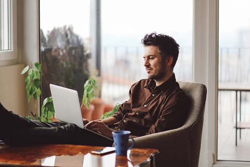 Vintage toned portrait of a young man working at the table in the bright and beautiful apartment on the high floor in Belgrade, Serbia. He is wearing casual, everyday clothes, a brown shirt, and having a cup of coffee as well.