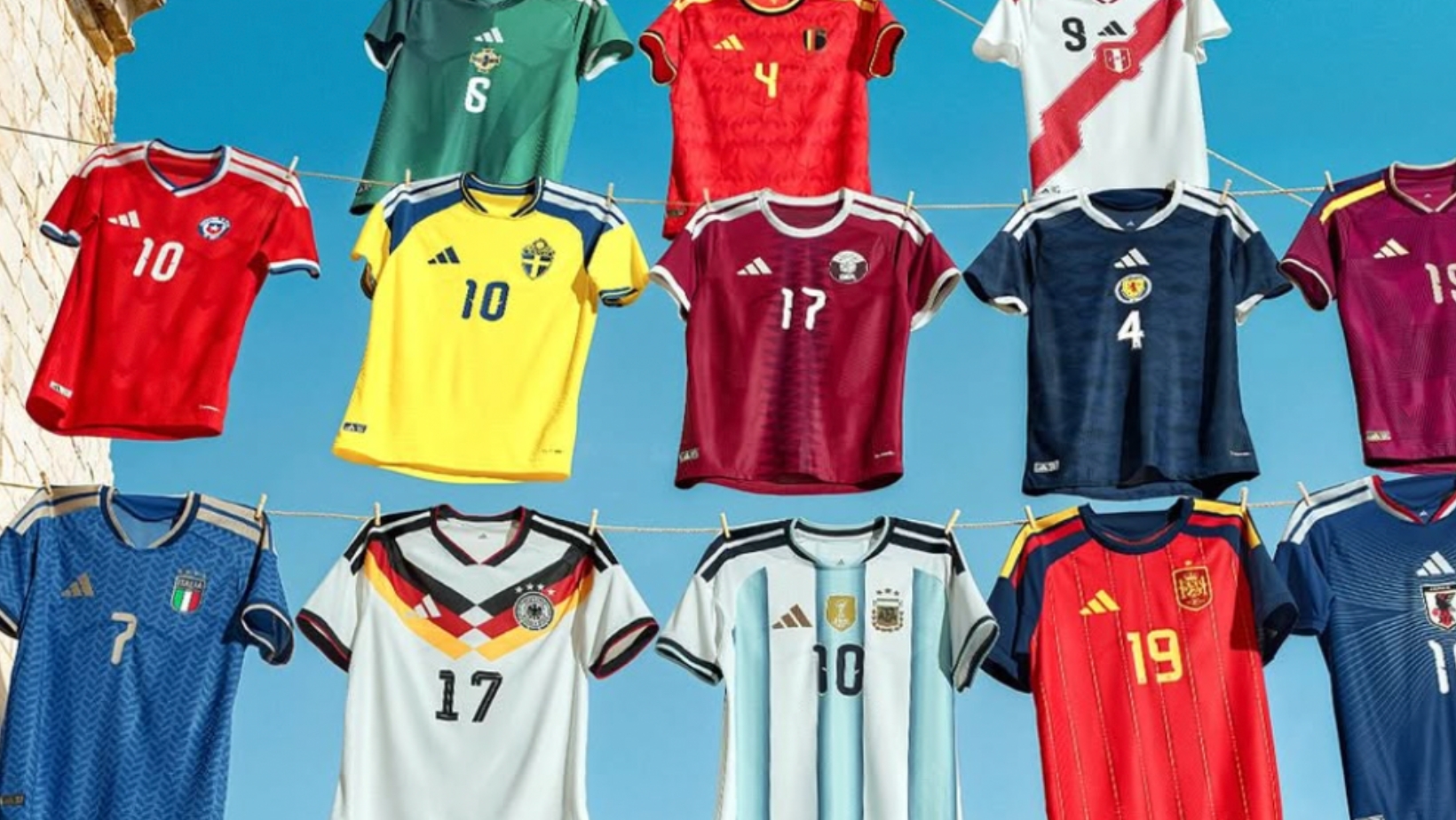 Sous un ciel bleu éclatant, 22 maillots aux couleurs vives flottent côte à côte, suspendus sur des cordes à linge comme des drapeaux de fierté nationale.