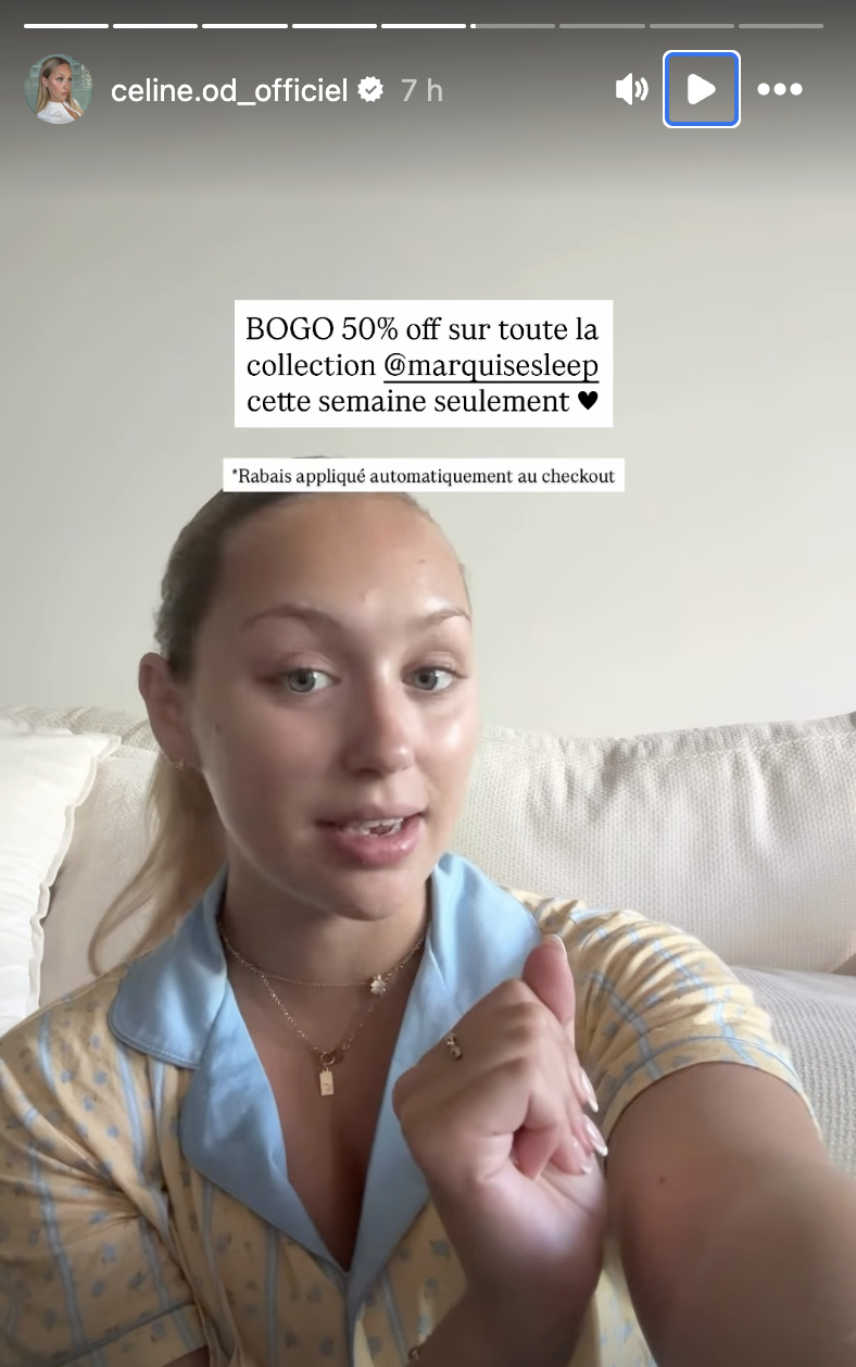 «Merci pour tout le support! J’ai décidé de faire une petite sale cette semaine sur le site web de Marquise. La promotion est active tout de suite, et je pensais en parler ici en premier, parce qu’il y a certaines de nos tailles qu’il n’en reste pas beaucoup. Donc, it might be time to purchised! Donc, ça va être un buy one, get one 50% offer. Vous pouvez acheter n’importe quel pyjama, puis avoir votre deuxième à 50 % (…)», dévoile-t-elle en souhaitant à tous un bon magasinage.